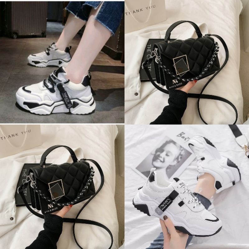 paket 2in1 sneakers dan tas selempang rantai bahan sneakers sintetis size 37-40 bahan tas sintetis uk 22x16x8cm 2ruang besar tas dan sandal mewah cocok buat kamubuat pergi kemana aja.penampilan tambah ok dan bikin kamu tambah cantik
