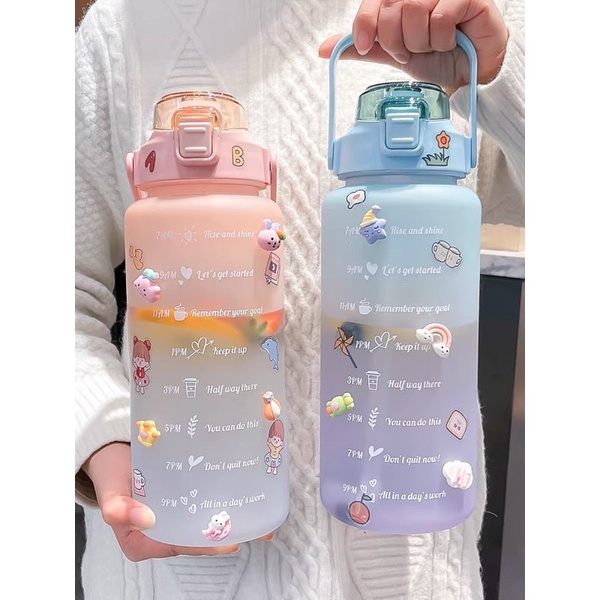 Free sedotan , sticker 2d & 3d Botol Minum 2 Liter + 900ml Tutup Flip Dengan Sedotan Tempat Minum Air Penanda Waktu