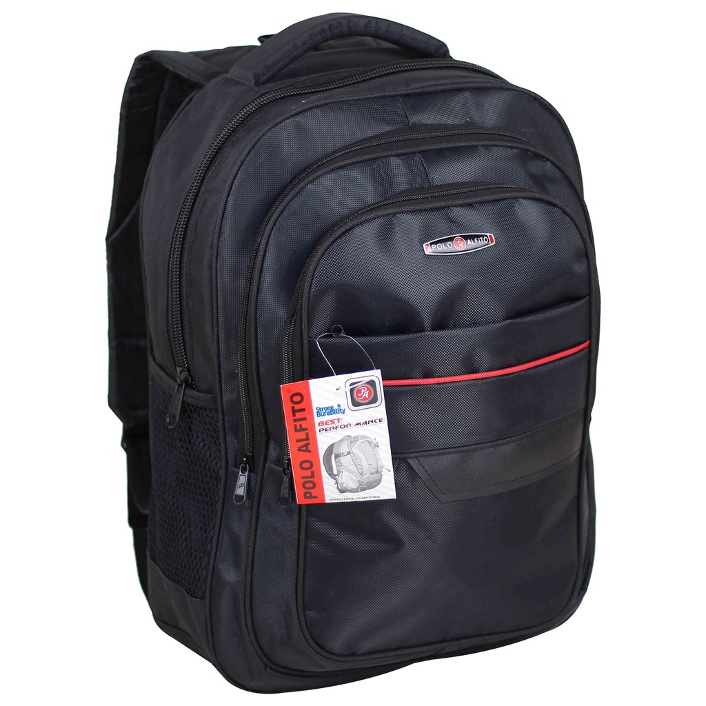 Tas Ransel Polo Alfito HItam Polos. Tampil dengan design baru yang elegan, berbalut bahan dolby yang halus mampu menampung alat-alat tulis anak sekolah maupun untuk perlengkapan kerja dinas. Berukuran 34x16x47 memiliki 3 Ruang Resleting Utama + 2 Saku Jaring Kanan Kiri. serta busa punggung empuk dengan sirkulasi udara yang baik.