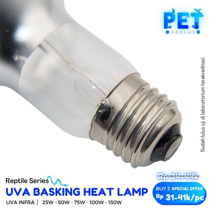 FITUR COMPLETE UVA IRH LAMP : - Dilengkapi dengan (FROSTED COATING) untuk lampu sorot siang hari spektrum luas untuk terarium - Secara efektif menyediakan kebutuhan harian sinar Ultraviolet A (Penghangat) - Mendorong pertumbuhan dan perkembangan, memandu pacaran kura, kawin, bertelur dan sebagainya dll - Membantu meningkatkan nafsu makan reptil dan efektif membantu pencernaan - Mencegah penyakit FLU/Pneumonia - Memberi Suhu Udara yang lebih stabil