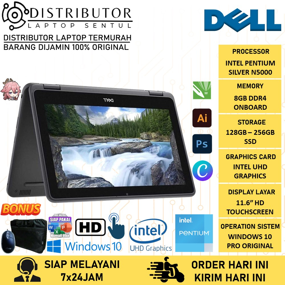 Spesifikasi Laptop : - Processor : Intel Pentium Silver N5000 (Cache 4M, up to 2,70 GHz) - Memory : 8GB 2400MHz DDR4 - Storage : M.2 128GB PCIe NVMe Class 35 Solid State Drive - Display : 11.6 HD (1366 x 768) Touchscreen - Operating System : Windows 10 PRO - Dimensions : Height: 0.82 (20.8 mm) x Width: 11.94" (303.3 mm) x Depth: 8.11" (206 mm) - Weight : starting at 2.79 lbs (1.27 kg) - Operating System : Windows 10 Pro