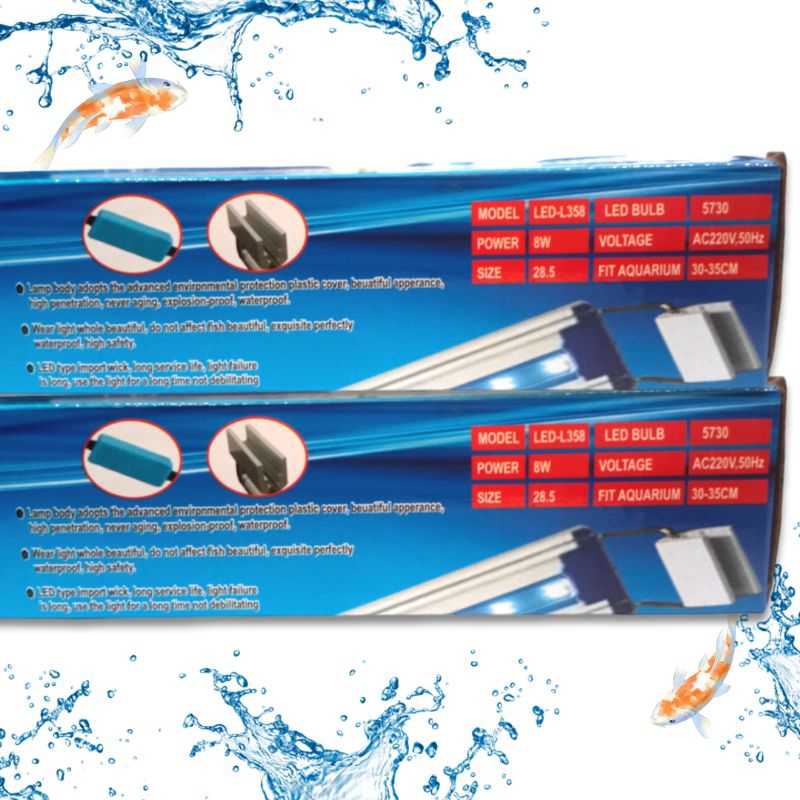 Lampu led aquarium di pasang diatas aquarium. Merk : LUCKINESS Type : L 358 Warna lampu : biru putih Panjang lampu : 28,5cm Untuk aquarium : 30cm-35cm Daya : 8watt