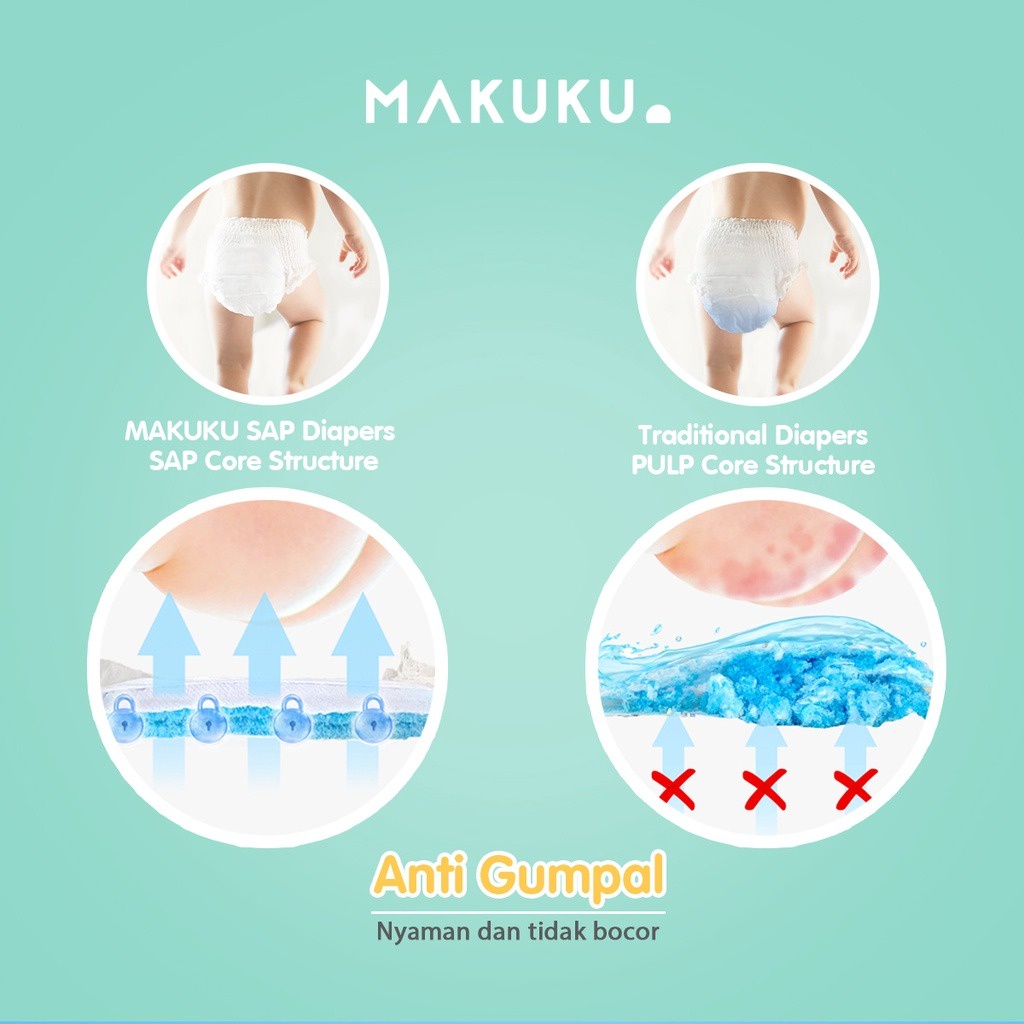 Popok New Generation SAP Core Structure Pertama di Indonesia, popok generasi terbaru dengan struktur yang stabil membuat popok Makuku tidak mudah menggumpal dan jatuh, serta membuat bayi tidak merasa berat saat bergerak. Penyerapan kecepatan tinggi membuat SAP yang masuk ke popok akan cepat diserap merata sehingga dapat melindungi pantat bayi dari iritasi.