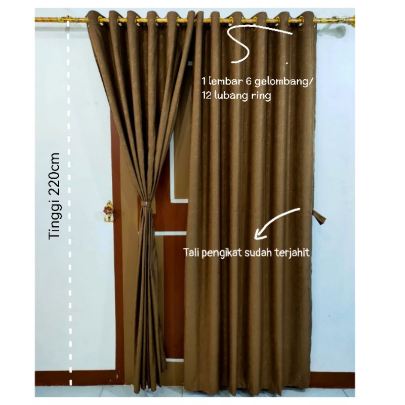Ada 3 Ukuran: - GORDEN PANJANG (135x220), bisa untuk pintu dan jendela. Ukuran kurang lebih Lebar 135cm x Tinggi 220cm | 12 Lubang Ring