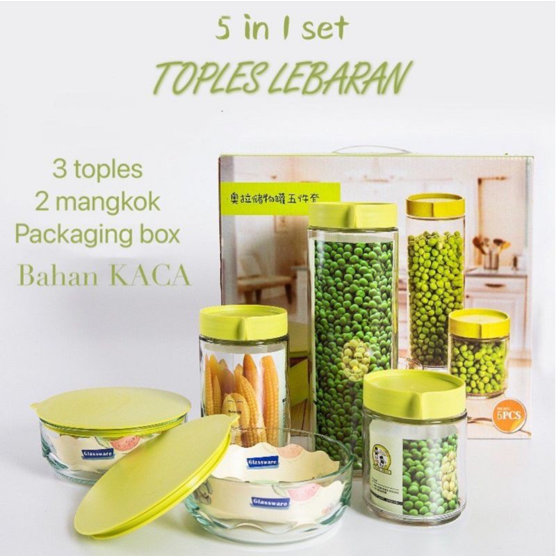 Terdiri dari 5 pcs Ukurannya: 1 pcs Toples ukuran +/- 350 ml 1 pcs Toples ukuran +/- 500 ml 1 pcs Toples ukuran +/- 850 ml 2 pcs Mangkok + tutup ukuran +/- 420 ml
