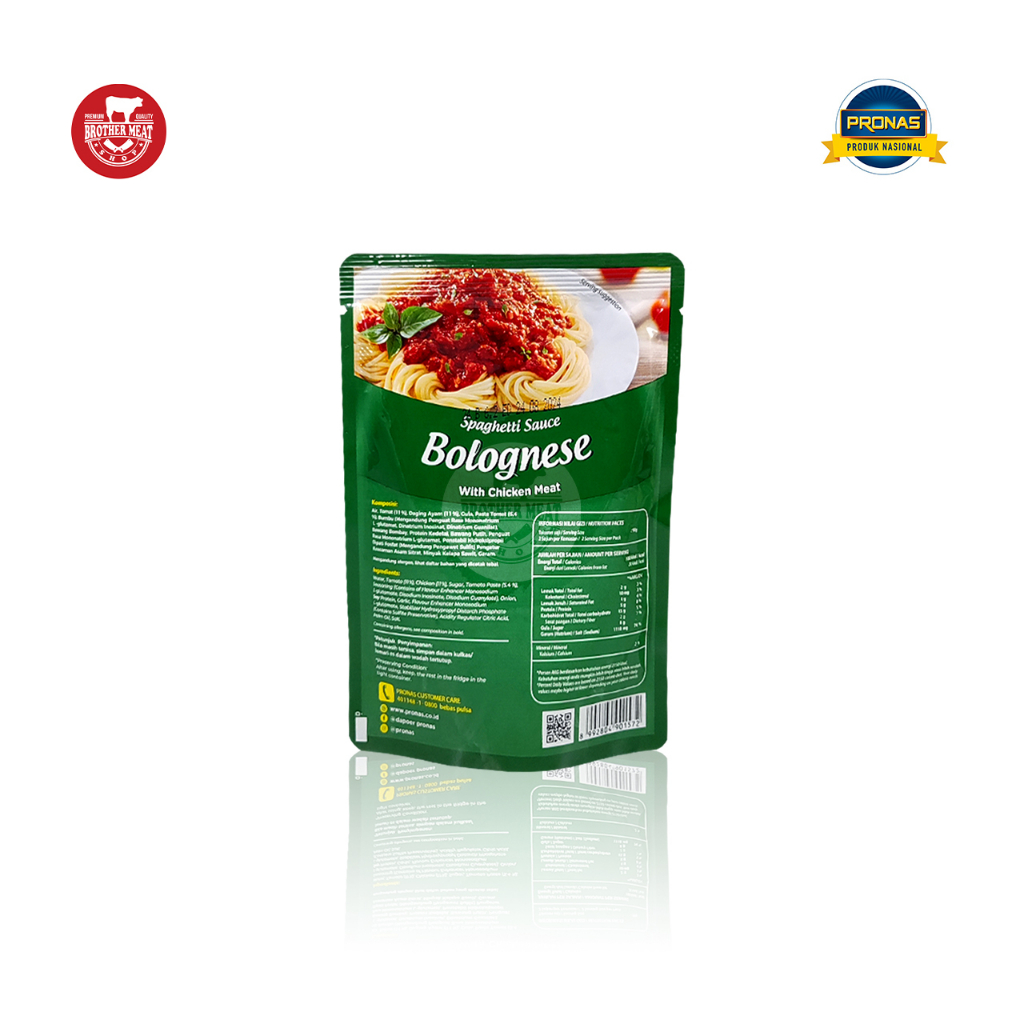 INFORMASI PRODUK: Pronas Saus Bolognais dengan daging ayam [175gr]. Pronas Saus Bolognais diperkaya dengan daging ayam berkualitas. Praktis karena tinggal dipanaskan dengan sajian spaghetti. Masukkan ke dalam wadah kedap udara setelah di buka dan disimpan dalam lemari es. - Jenis Produk: Saus Bolognese [Chicken] - Berat: 175gr - Penyimpanan: -18°C (freezer). - Sertifikasi : Halal Terverifikasi MUI.