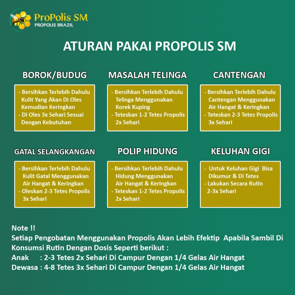 👉🏻 Nama : PROPOLIS SM 👉🏻 Bentuk Sediaan : Cair 👉🏻 Kemasan : Botol Plastik 6ml 👉🏻 Komposisi : 100% Propolis Brazilian 👉🏻 Legalitas : BPOM TR 193624961 Dan HALAL MUI 👉🏻 Produksi : CV Sami Mandjoer Yogyakarta