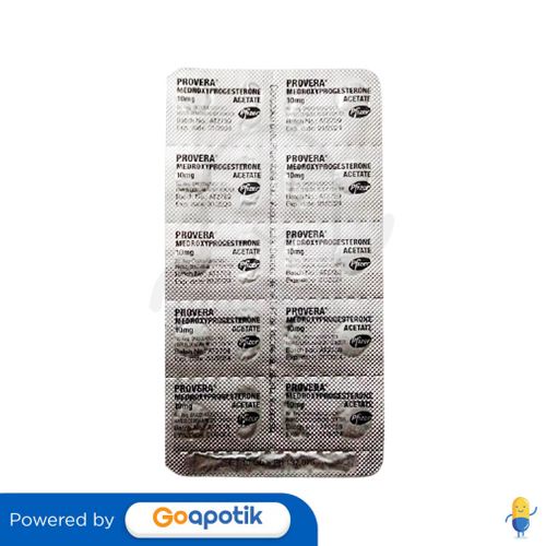 Deskripsi : PENGGUNAAN OBAT INI HARUS SESUAI PETUNJUK DOKTER. Provera merupakan obat yang dapat Digunakan untuk menghentikan pendarahan abnormal dari uterus, mengembalikan siklus normal menstruasi pada wanita dengan haid tidak teratur. | Komposisi : Tiap tablet mengandung Medroksiprogesteron asetat 10 mg | Dosis : ATURAN PAKAI HARUS SESUAI DENGAN PETUNJUK DOKTER. Pendarahan : 1 tablet 1 kali sehari selama 10-14 hari. Terapi endometrosis : 1 tablet 3 kali sehari selama 90 hari dimulai dari hari menstruasi pertama. | Indikasi : Digunakan untuk menghentikan pendarahan abnormal dari uterus, mengembalikan siklus normal menstruasi pada wanita dengan haid tidak teratur. | Perhatian Khusus : Hentikan pengobatan jika tiba-tiba kehilangan sebagian atau seluruh penglihatan, proptosis atau diplopia; migrain dan gangguan emboli; epilepsi, migrain, asma, disfungsi jantung atau ginjal. Riwayat depresi, toleransi glukosa dan pasien diabetes. Dapat mengganggu kemampuan mengemudi atau mengoperasikan mesin. Hindari penghentian progesteron secara tiba-tiba; laktasi. | Kemasan : Blister 10 tablet | NIE : DKI0054200210C1