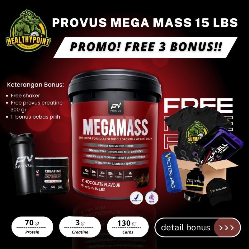 Tahukan Anda salah satu alasan mengapa anda sulit meningkatkan mass otot walaupun sudah mengkonsumsi berbagai macam supplement weight gainer ? hal tersebut di karenakan kebanyakan weigh gainer pada umumnya hanya ber fokus pada jumlah kalori yang setinggi-tingginya.Namun pada PROVUS MEGA MASS Gainer , anda akan mendapatkan protein berkualitas dari bahan Whey Protein Concentrate, serta dengan rasio yang ideal untuk meningkatkan massa otot sambil menjalani proses Bulking.