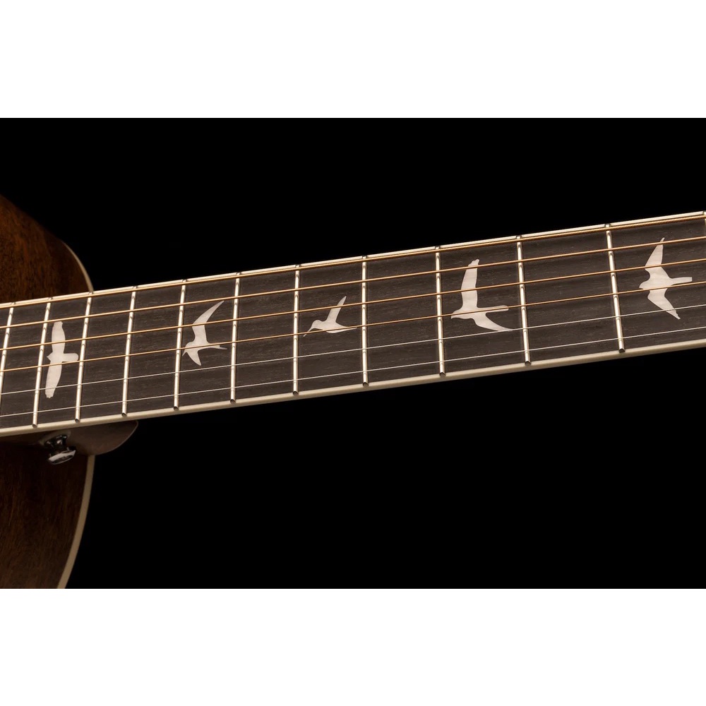 Available in three satin finishes with herringbone rosettes and accents, PRS SE Parlor acoustics look as good as they sound. Other high-quality features include a solid mahogany top, ebony fretboard and bridge, bone nut and saddle, as well as PRS trademark bird inlays and headstock design. PRS SE Parlor acoustics come with a gig bag and are strung with 12-53 strings.