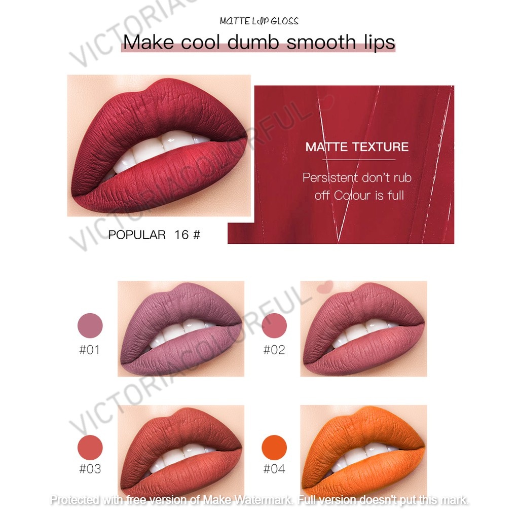 Tips : 1.Matte Velvet Kind. 2.It's Waterproof, and would Not stick on Cup. 3.it's better to use the lip balm or based lip items before putting it on your lip. 4. It will have good effect if you apply a very thin layer. 5.This lipgloss is very dry, please don't clip your lips before it dry, or it will be sticky. 6.It will looks a little darker if you use lip brush than your hands. so Lip brush is strongly recommended. 7.Oil food would make it fade a little,so you might need to avoid french fries when wearing this lip gloss. 8.Please apply the transparent or similar powder on your lip if you feel it is sticky. 9.Please use professional makeup remover oil to clean them off from lips.