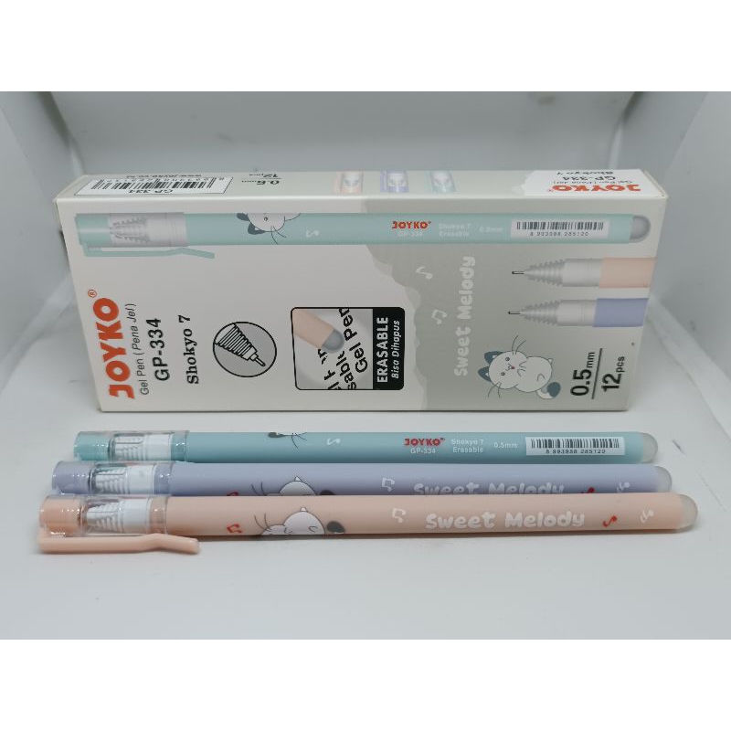 Pulpen Gel Hitam Tajam Joyko Bisa di Hapus Bermotif gambar kelinci , kucing warna warni GP 333 GP 334 1 pak isi 12 pulpen