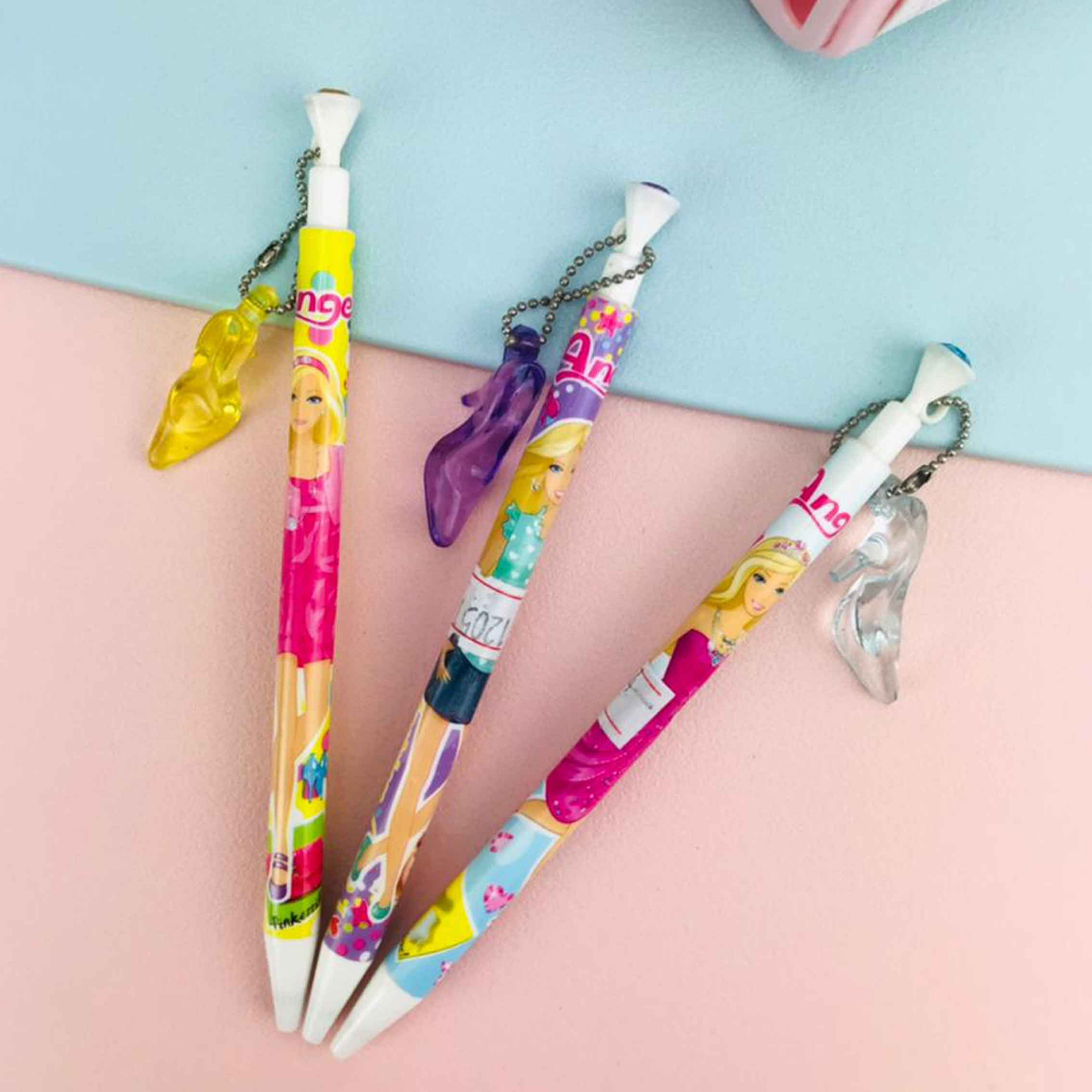 SPESIFIKASI PRODUK : - Ukuran keseluruhan pensil 14cm - Warna gantungan sepatu barbie : Biru, Kuning, Ungu - Warna Pada Pensil : Kuning, Biru, Ungu Kode : 120514