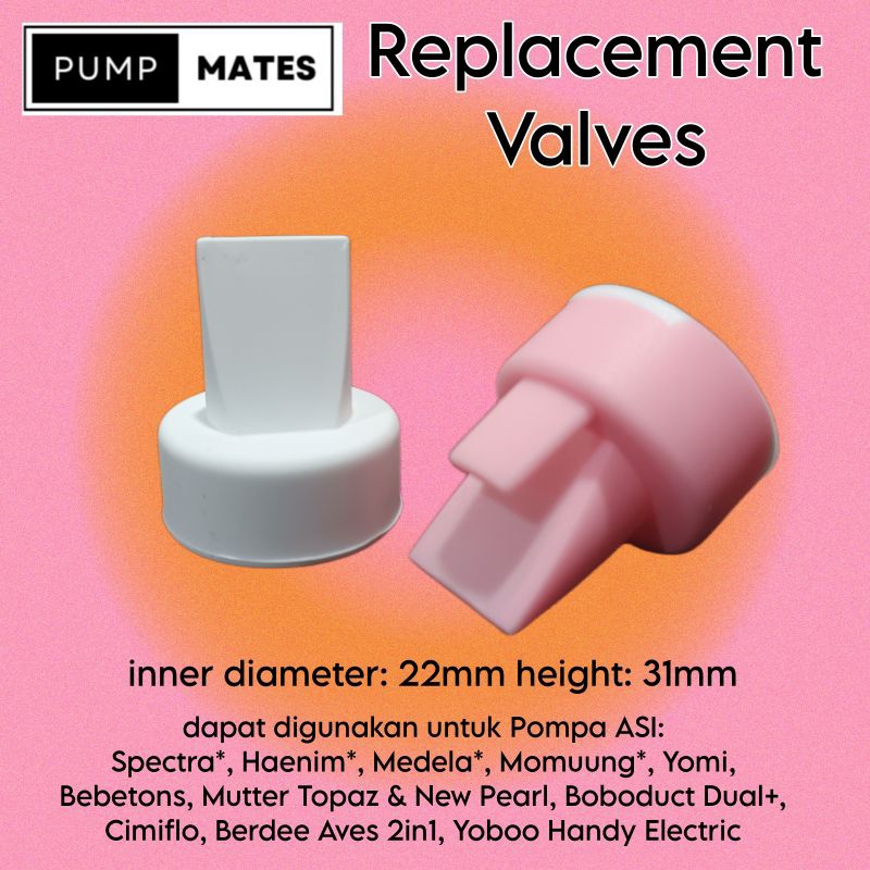 Pink Valve dan white Valve ini kompatibel untuk: - Semua tipe Spectra corong standard semua ukuran, tidak bisa digunakan pada corong handsfree Spectra. - Semua tipe Haenim corong - Medela (Only Jenis Valve) - MomUung (hanya bisa di corong 24mm) - Yomi - Bebetons Neo / Palm / Neo V2 - Mutter Topaz - Boboduck Dual+ - Cimiflo - Berdee Aves 2in1 - New Mutter Pearl - Momabae Diamond - Yoboo Double Handy Electric Breastpump