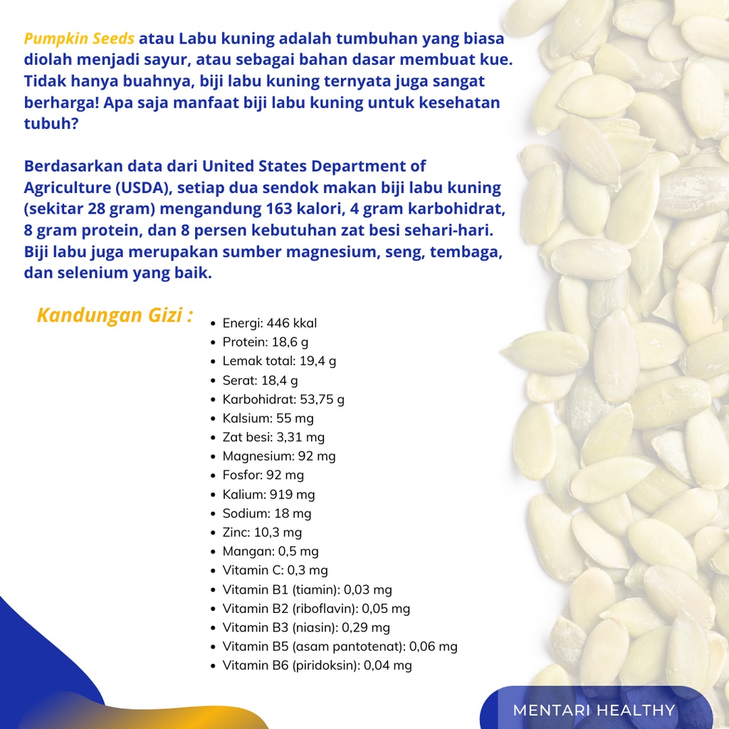 Merupakan biji yang mengandung mineral seperti Magnesium, Zink, Mangan, Fosfor, Zat Besi & Tembaga. Biji labu juga merupakan sumber Protein, Omega-3. Omega-6 & Vitamin E dalam biji labu dalam bentuk alpha-tocopherol.