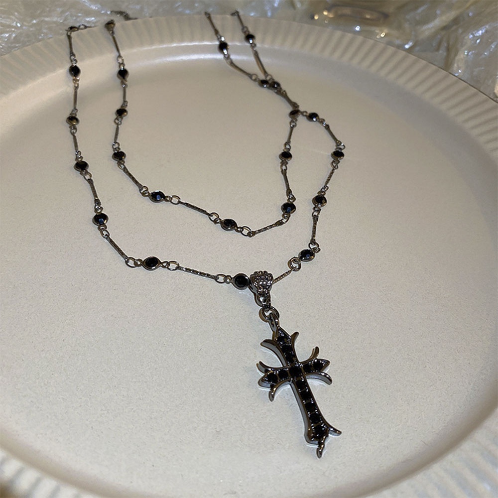 Punk Dark Cross Bead Double Layer Necklace Women's Long Necklace Necklace Jewelry Gift for Girlfriend Dark Black Zircon Cross Beaded Necklace Women's Summer Long Double-layer Lapto