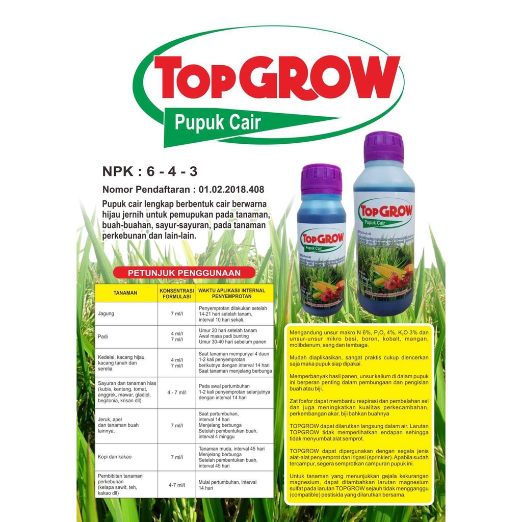 ✅ Mengandung unsur makro N 6%, P2O5 4%, k2O 3%, dan unsur unsur mikro besi, boron, kobalt, mangan, molibdenum, seng dan tembaga ✅ Mudah diaplikasikan, sangat praktis cukup diencerkan saja maka pupuk siap dipakai ✅ Memperbanyak hasil panen, unsur kalium di dalam pupuk ini berperan penting dalam pembungaan dan pengisian buah atau biji ✅ Zat pospor dapat membantu respirasi dan pembelahan sel dan juga meningkatkan kualitas perkecambahan, perkembangan akar, biji bahkan buahnya ✅ TOPGROW dapat dilarutkan langsung dalam air. larutan TOPGROW tidak memperlihatkan endapan sehingga tidak menyumbat alat semprot ✅ untuk tanaman yang menunjukan gejala kekurangan magnesium , dapat ditambahkan larutan magnesium sulfat pada larutan TOPGROW sejauh tidak mengganggu (compatible) pestisida yang dilarutkan bersama