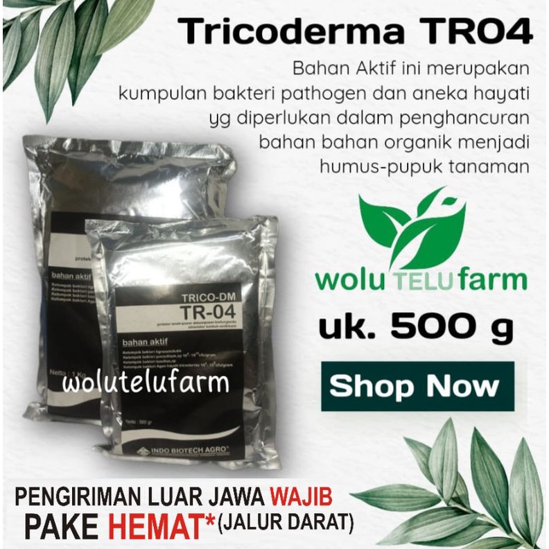 DOSIS dan APLIKASI : 1. Pencegahan infeksi tanah : tabur dosis 3-5kg TR04 per hektar pada sekitar perakaran atau dengan kocor dosis 200-400lt per kg ( untuk hasil optimal hindarkan saat aplikasi dengan sinar matahari) 2. bahan organik yg telah disiapkan setinggi 50-100cm atau volume 0.5 ton, disiram/disemprot dengan air yg sudah dicampur dengan 𝗧𝗥𝟬𝟰 dosis 0.5kg + 50 liter air kemudian tutup rapat permukaan dengan plastik gelap agar lembab dan di aduk setiap minggu. pengomposan berlangsung 2-4 minggu dengan bentuk remah, berwarna hitam, tidak berbau dan siap digunakan sebagai pupuk organik bermutu. 3. Untuk tabur per lubang tanah 1-2 sendok tanaman semusim/hias/horti/sayur. 50-100gr per pohon untuk tanaman buah atau tahunan NOTES untuk pengiriman luar pulau menggunakan jasa kirim economy ya gan (jalur darat), NO je en te express (udara ✈)