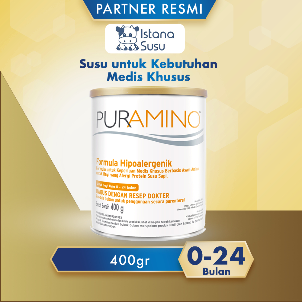 Puramino Susu Formula [400 g] adalah susu formula bayi dengan keperluan medis khusus berbahan dasar asam amino yang hipoalergenik untuk penatalaksanaan diet bayi dengan alergi protein susu sapi yang berat, yang tidak dikelola secara efektif oleh formula hidrolisat yang ekstensif. PurAmino juga diindikasikan untuk manajemen makanan bayi dengan beberapa alergi protein makanan.