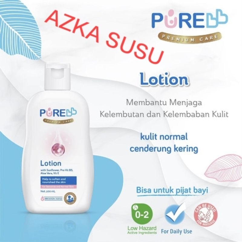 Purebaby Lotion adalah lotion perawatan kulit tubuh secara menyeluruh untuk bayi berusia 6 bulan keatas dengan triple action (menutrisi, meregenerasi,menyejukkan) kulit sehingga cocok untuk kulit normal