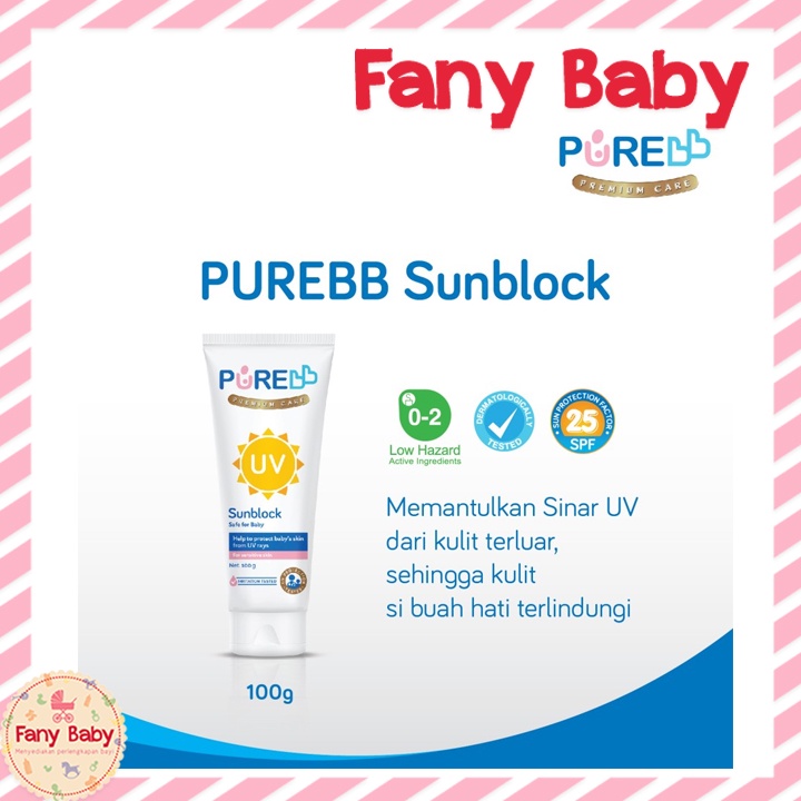 Menjemur bayi di bawah sinar matahari tanpa perlindungan sama sekali merupakan hal yang sangat berisiko. Kulit bayi yang lebih tipis 40-60% dibanding kulit orang dewasa, ditambah memburuknya kondisi alam seperti menipisnya lapisan Ozon, dapat menyebabkan intensitas radiasi Ultra Violet (UV) ke kulit semakin tinggi. Kulit bayi yang sering terpapar sinar matahari (UVA & UVB) dapat menimbulkan kulit terbakar, mengganggu sistem imun, terjadinya keriput serta bintik hitam penuaan, bahkan terjadinya mutasi sel pada kulit yang dapat menyebabkan tumbuhnya sel kanker. Pure Baby Sun Block - 100gr hadir dengan formula khusus low hazard yang tidak meresap ke dalam kulit sehingga aman dan bebas iritasi untuk kulit sensitif si kecil.