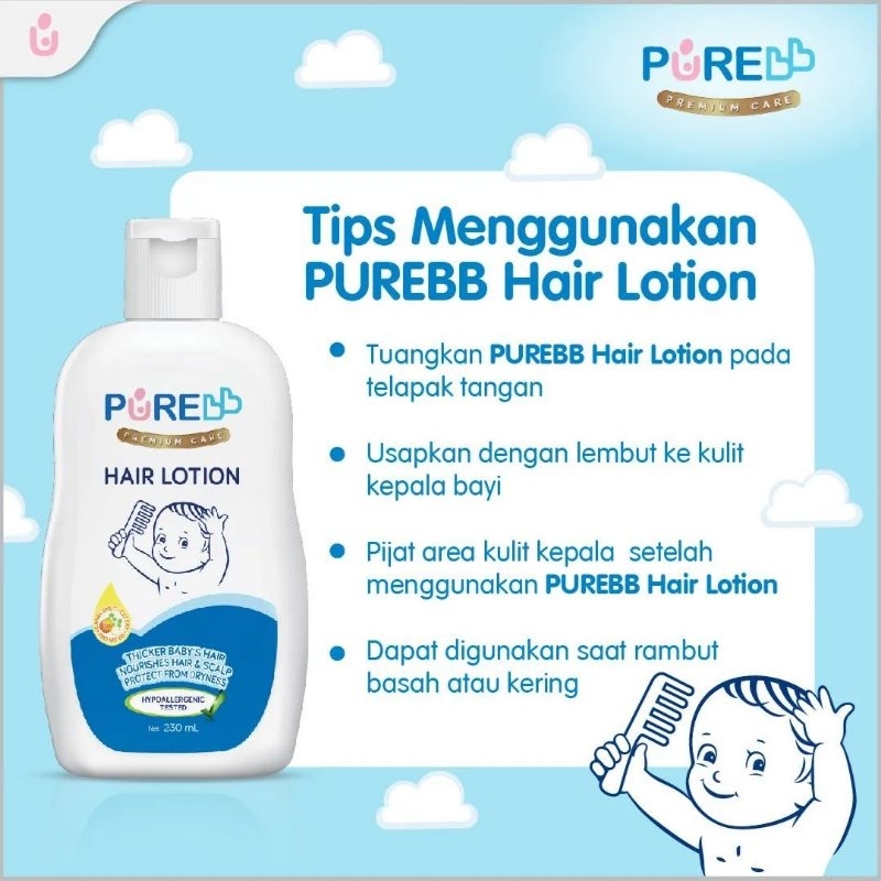 Pure bb Hair Lotion dengan formula yang lembut untuk perawatan rambut dan kulit kepada bayi, membantu memelihara kesehatan rambut hitam berkilau dan lebat. Diperkaya dengan kandungan Kemiri, Seledri dan Pro Vit B5, membantu melindungi kulit kepala bayi dari resiko kekeringan sekaligus membantu menutrisi rambut bayi.
