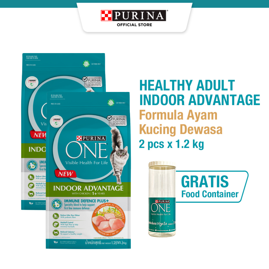 Purina ONE Indoor Chicken menyediakan nutrisi yang disesuaikan untuk memenuhi gaya hidup khusus kucing Anda di dalam ruangan. Ini mengandung serat prebiotik dari sumber alami untuk membantu mengurangi aroma feses dengan mempromosikan flora usus yang seimbang. Formulasinya yang rendah kalori (dibandingkan dengan Purina ONE Adult Formula), membantu menjaga berat badan yang sehat, dengan kucing dalam ruangan cenderung kurang aktif