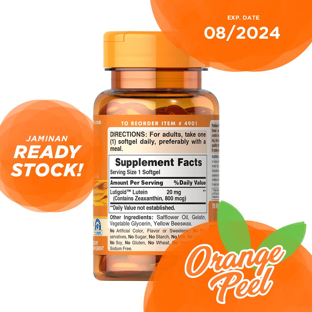 ** Puritan Lutein 20 mg with Zeaxanthin 60 & 120 Softgels : Komposisi Lutein 20 mg mengandung Zeaxanthin 800 mcg ( 0.8 mg ) 1 botol isi 60 cukup untuk 2 bulan pemakaian 1 botol isi 120 cukup untuk 4 bulan pemakaian