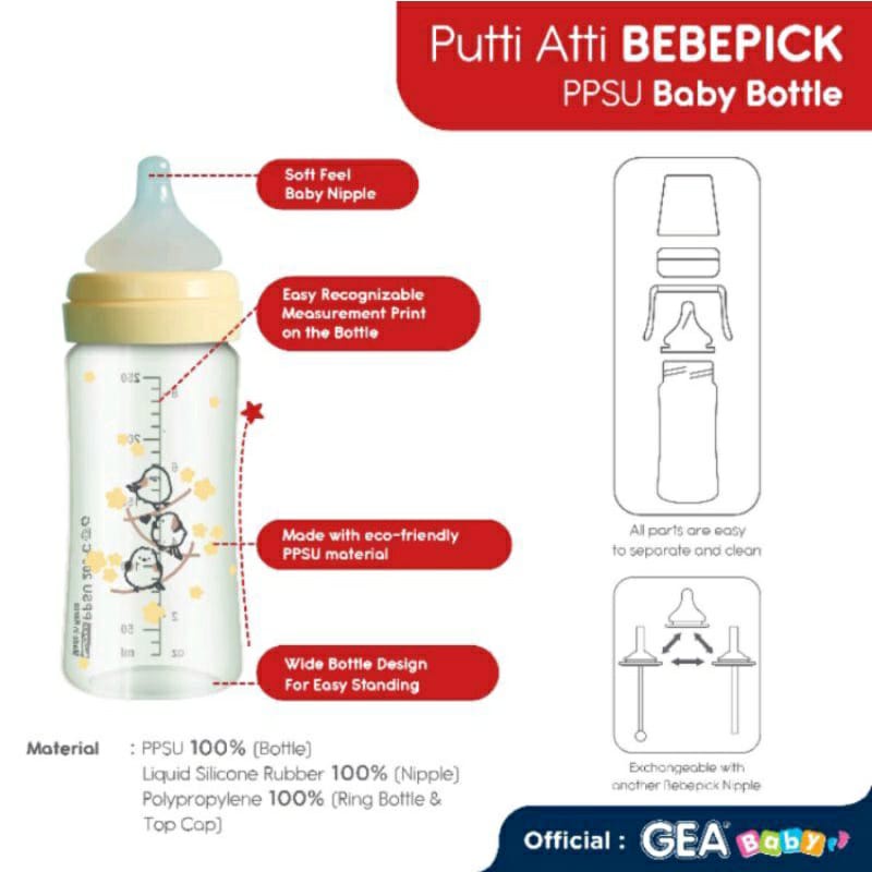 • medical grade: bahan PPSU yang digunakan adalah bahan dengan kualitas medical grade sehingga aman untuk konsumsi bayi • anti-colic air valve: di lengkapi dengan 2 katup anti-kolik (terletak di nipple), untuk membantu mengontrol aliran udara sehingga tidak terkonsumsi oleh bayi untuk menghindari kolik • soft feel nipple: nipples yang terbuat 100% bahan LSR yang dirancang dengan desain terintegrasi agar dot Putti Atti lembut dan mirip seperti puting ibu sehingga mengurangi kemungkinan bayi bingung puting. • patented assembly: dengan desain patented rakitan yang mudah di lepas-pasang sehingga botol dapat dibersihkan secara menyeluruh agar tetap higienis • aman untuk di steam, rebus, atau di sterilasasi menggunakan UV • ppsu body & silicone nipple memiliki ketahanan temperatur mulai dari -18 hingga 180 derajat Celcius