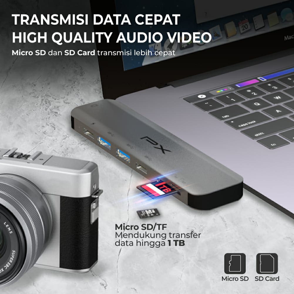 SPESIFIKASI Merek : PX Model : UCH27 Warna : Space Grey (Abu-Abu) Input : USB Type C 3.1, Thunderbolt 3 Output : 4K HDMI+USB 3.0*2+Type C*1+SD Card/Micro SD*1+Type C (PD Charging) Dimensi Produk : 129.07x1x32.7mm