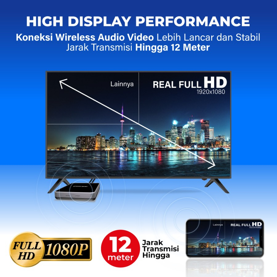 TRANSMISSION STABLE NO NOISE Perangkat ini dapat mencerminkan audio video wireless (tanpa kabel) hingga 12 meter. Hanya dengan menyalakan wifi pada Smartphone/Tablet/Laptop/Macbook, Anda dapat mencerminkan audio video dengan mudah.