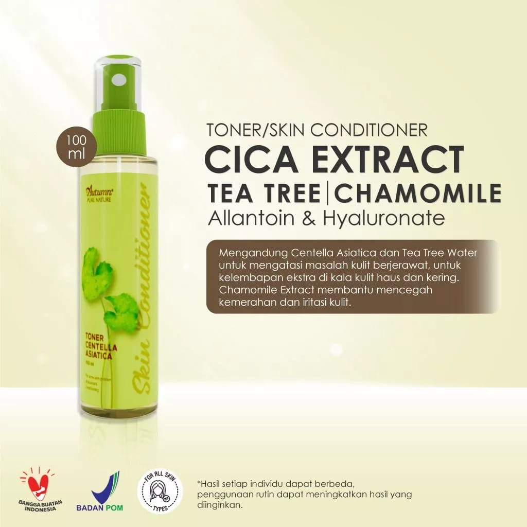 AUTUMN TONER SKIN CONDITIONER WITH CENTELLA ASIATICA Mengandung Centella Asiatica dan Tea Tree Water yang mengandung bahan essential untuk mengatasi masalah kulit berjerawat. Dikombinasikan dengan Allantoin dan Hyaluronate untuk kelembaban ekstra di kala kulit haus dan kering. Chamomile Extract membantu mencegah kemerahan dan iritasi kulir.