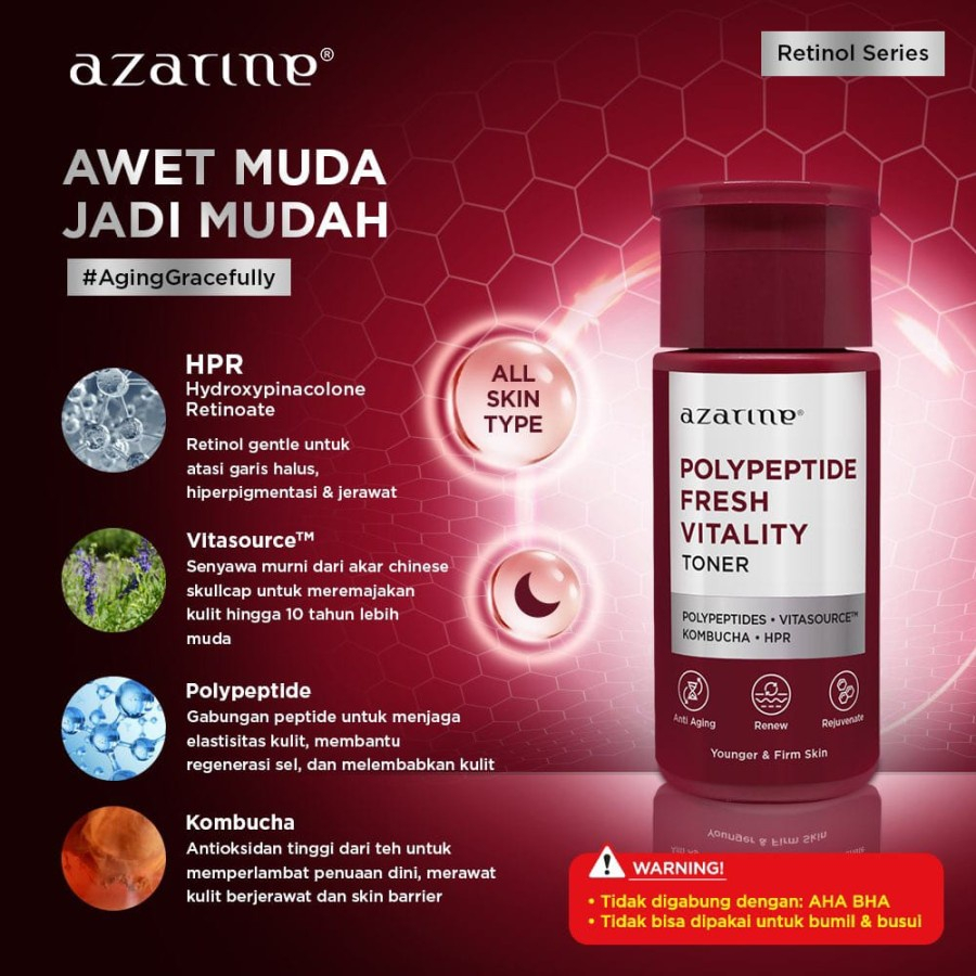 5. Azarine Polypeptide Fresh Vitality Toner 90ml Toner wajah yang diformulasikan dengan bahan-bahan seperti Polypeptides, Vitasource™, Kombucha, dan HPR {Hydroxypinacolone Retinoate} denpan fungsi utama yaitu untuk menghambat tanda penuaan sepertl flek hitam, garis halus, kulit kusam, dan juga membantu meremajakan kullt dan tetap terjaga kelembapannya. Toner ini bisa dipakai untuk semua jenis kulit dan dapat digunakan pada malam hari.