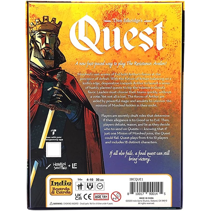 Players are secretly dealt roles that determine if their allegiance is to Good or to Evil. Then, players debate, reason, and lie as they decide who to send on Quests—knowing that if just one minion of Mordred joins, the Quest could fail. Quest includes 25 different characters and many different ways to play the base game.