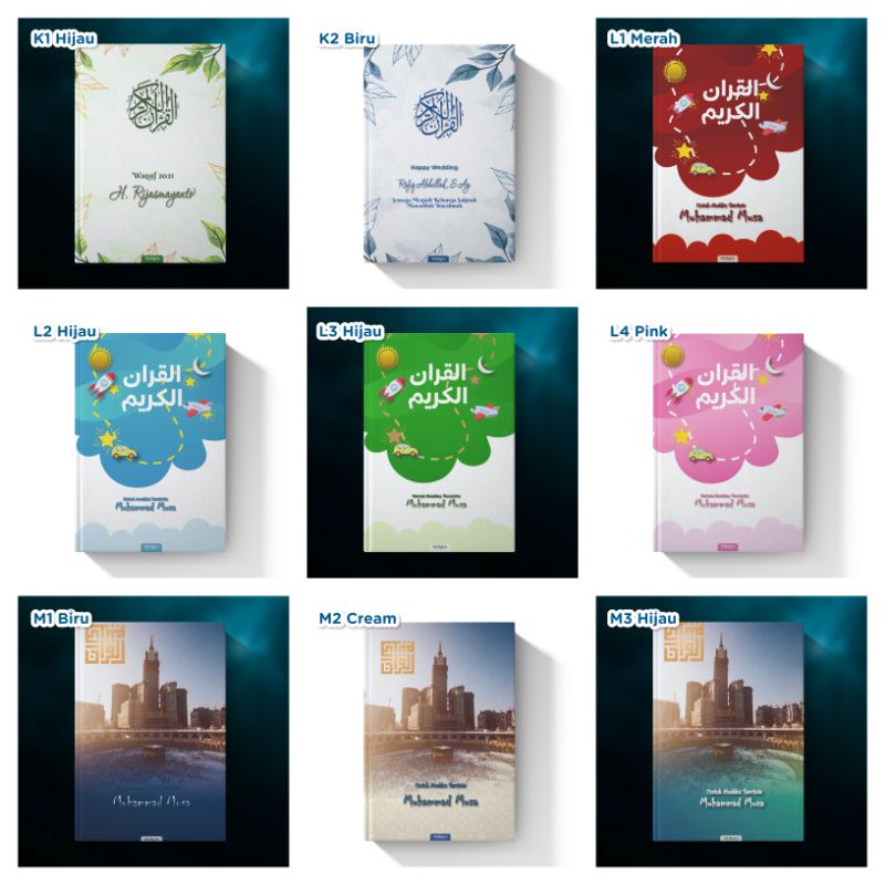 Pilihan Al Quran - Quddus Dian Rakyat : Mushaf non Terjemahan, Non Tajwid Warna (Kertas HVS Putih) - Rosyid Mubarok: Alquran HVS Terjemahan Per Kata Latin (Kertas HVS Putih) - Quddus Mubarok : Mushaf Non Terjemahan, Tajwid Warna (Kertas QPP Cream) - Al Azhar Jabal : Al Quran Terjemah Tanpa Tajwid Warna (Kertas QPP Cream) - Ar Rahman Mubarok : Al Quran Terjemah Tajwid Warna (Kertas QPP Cream)