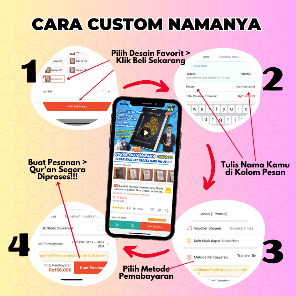 2. Mohon dicek dan dipastikan kembali Data Pesanannya ☑️ Kata dan Kalimat Penulisan Custom/Nama ☑️ Ukuran dan Warna Qur'an yang di-inginkan ☑️ Kapital atau Huruf Besar Kecil dalam Penulisan Custom/Nama ☑️ Titik, Koma, Tanda Petik atau Tanda Sambung di Penulisan ☑️ Dan Alamat Pesanannya