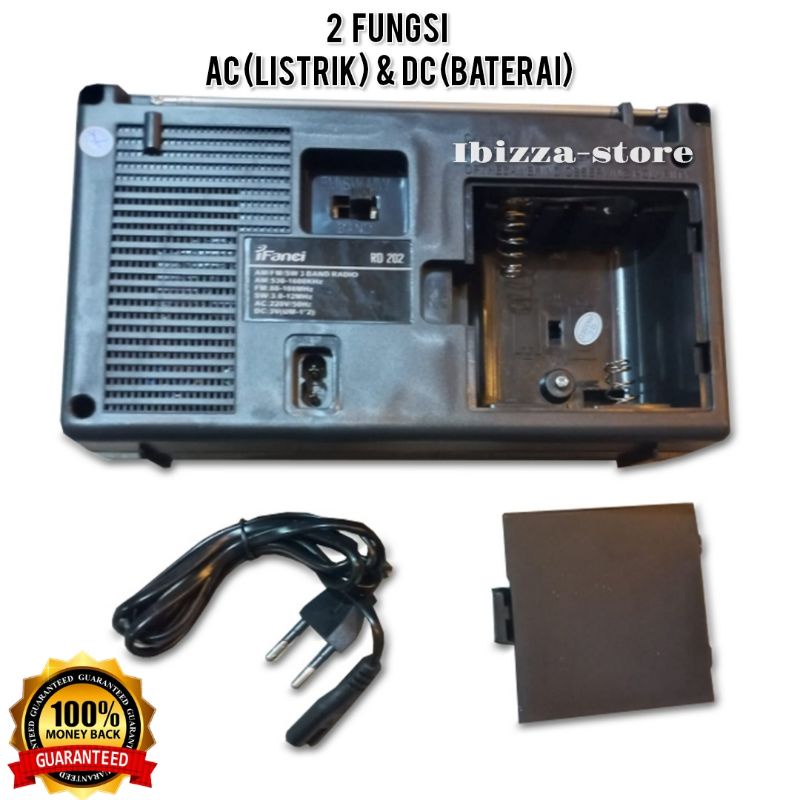 SPESIFIKASI: Merk: Infanci Model: RD 202 Sumber tenaga: AC 220V/50Hz (cable included) atau 2 baterai R20/LR20/D Size 1,5 V (not included) atau adaptor DC 3V (not included) Dimensi: 21 x 12 x 6,5 (cm) Range: FM = 88-108 MHz, AM = 530-1600 KHz, SW = 3-12 MHz