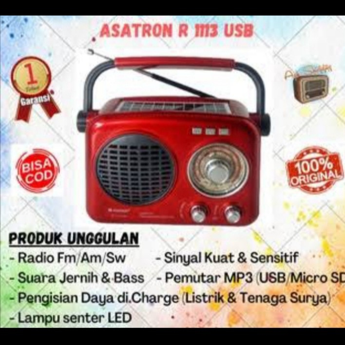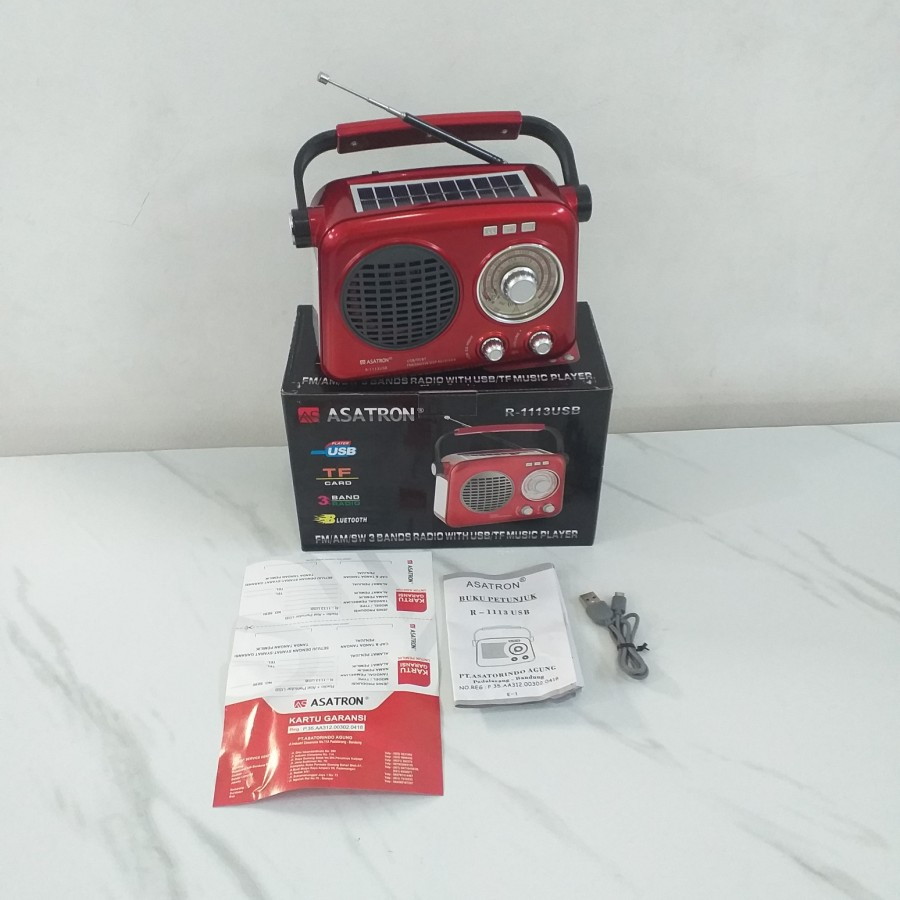 FITUR LENGKAP : 1. Saluran : 3 Band (FM, AM & SW) 2. Pemutar Audio/MP3 bisa menggunakan USB/Flashdisk/Memory Card/SD 3. Pengisian Daya bisa 4 - 6 Jam, ( jika penuh lampu indikator cas akan mati otomatis ) 4. Sistem cas bisa pake ENERGI MATAHARI 5. Penangkapan sinyal kuat 6. Suara Jernih Dan Bass 7. Desain Retro Klasik 8. Garansi Toko 1 Bulan, Garansi Asatron 1 Tahun 9. Lampu LED (auto ON jika gelap) 10. BLUETOOTH