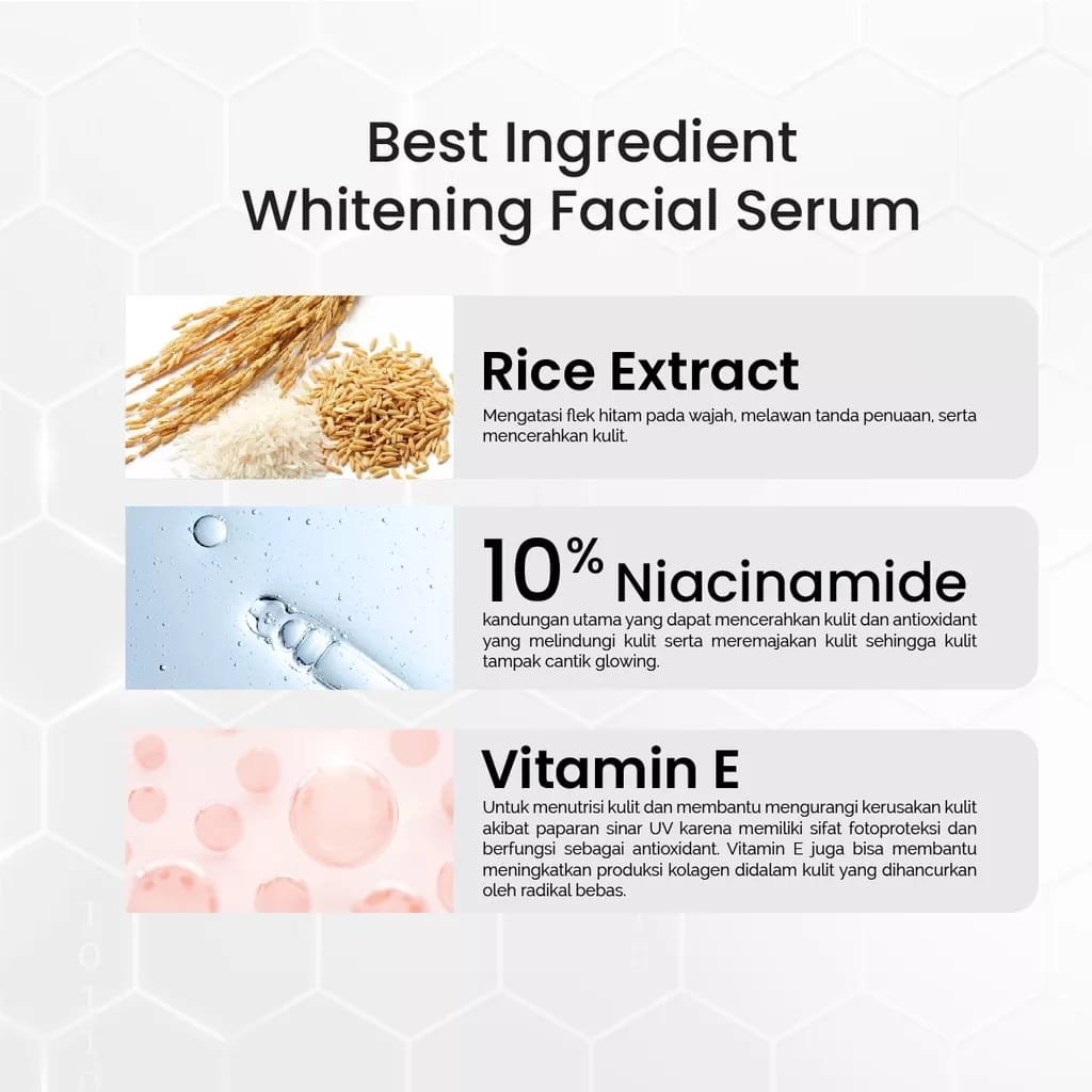Kandungan : - Niacinamide - Rice Extract - Vitamin E