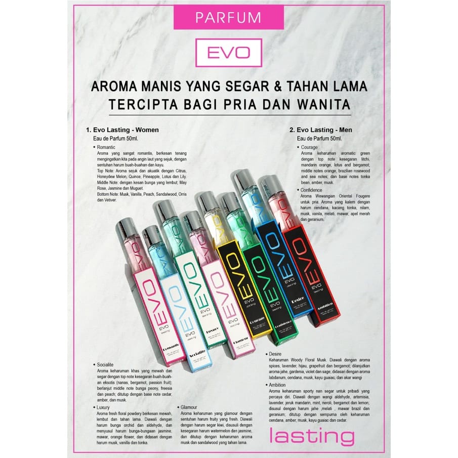 EVO Parfume Male & Female Series 50ml / Eau De Parfum Parfume Spray Male & Female EDP / Lasting 50ml. Wangi Tahan Hingga 8-9 jam (dalam ruangan ber AC). Tanggal Kadaluarsa : 4 tahun dari tanggal pembelian Komposisi: Ethyl Alcohol, Aqua (Water), Fragrance, PPG-20 Methyl Glucose Ether.