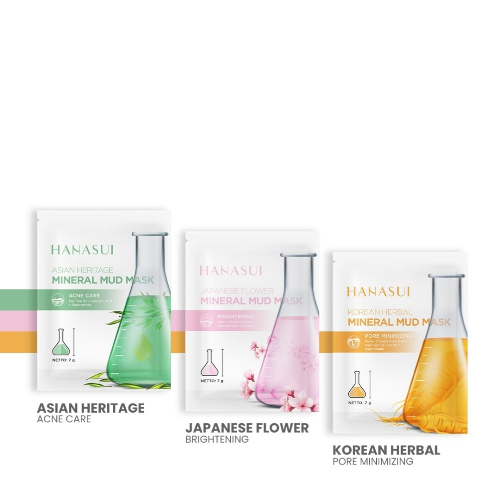 ASIAN HERITAGE BPOM NA18210200817 Hanasui menghadirkan Mud Mask dengan focus pada setiap permasalahan kulit wajah yang sering dialami para wanita. Masker lumpur yang berasal dari kandungan alami yang tinggi akan mineral yang dapat membantu mencerahkan dan merawat kulit wajah, Jerawat, Pori-pori yang besar serta kusam adalah penyebab utama dari berbagai masalah kulit. Kini masalah tersebut dapat diatasi dengan Hanasui Mineral Mud Mask Hanasui Mud Mask Asian Heritage mengandung Salicylic Acid dan Tree tea oil yang dapat merawat kulit berjerawat. Selain itu Hanasui Mud Mask juga Mengandung Shea butter, Niacinamide, Vitamin E dan Sodium Hyaluronate yang dapat membuat kulit wajah menjadi lebih lembap, lembut dan segar.