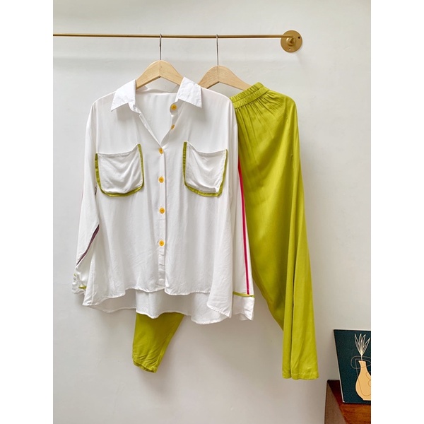 bahan rayon matt Airflow ya, sudah dapat one set (atasan dan bawahan) yaa. Pj celana : 89cm lingkar pinggang : 35-57cm L paha : 35cm
