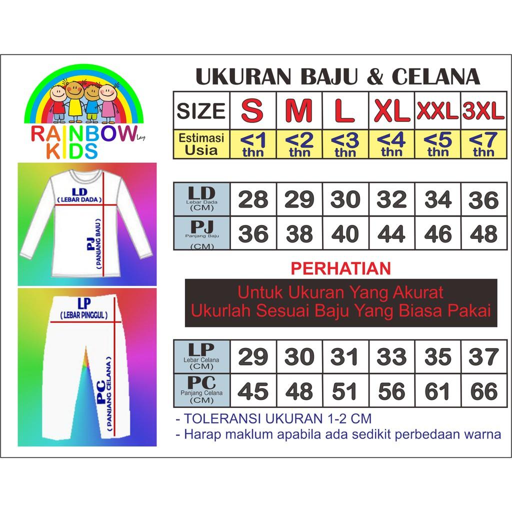 - Setiap Produk Rainbow Kids adalah produksi sendiri dengan kualitas bahan dan jahitan yang selalu terkontrol. - Produk kami sangat cocok untuk di pakai sehari2 maupun sebagai baju tidur dengan pilihan gambar yang sangat banyak dan lucu. - Untuk SETELAN terdiri dari 1Pcs Baju Dan 1Pcs Celana