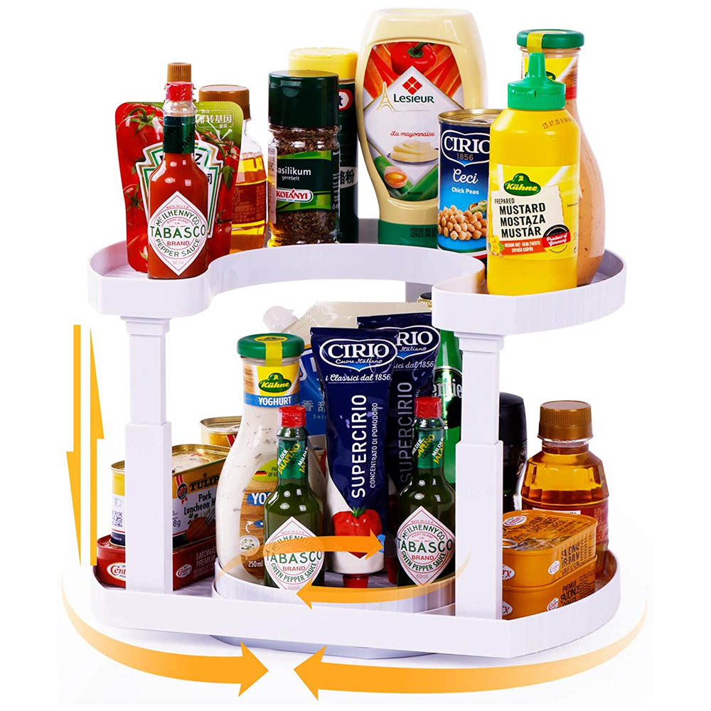 Rak putar 2 tingkat yang bisa kamu gunakan untuk berbagai keperluan dari menyimpan bumbu dapur, untuk rak makeup, untuk tempat alat tulis, untuk menaruh obat-obatan dan banyak lainnya. Rak ini punya keunggulan dimana punya 4 mode ketinggian sehingga makin fleksibel untuk ditaruh barang yang lebih tinggi serta bisa diputar sehingga mengambil barang dibagian belakang akan terasa lebih mudah.