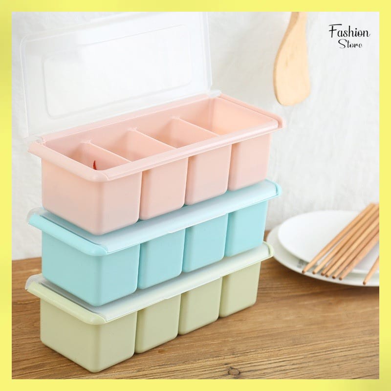 DESKRIPSI PRODUK : TEMPAT BUMBU 4 SEKAT / KOTAK BUMBU 4 IN 1 / TEMPAT BUMBU DAPUR / RAK BUMBU DAPUR WADAH BUMBU / SEASONING BOX 4IN1