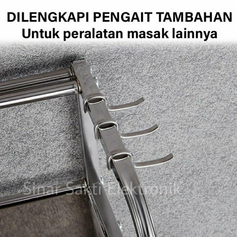 Rak Dapur Multifungsi bisa untuk segala jenis pisau, Peralatan Masak, Bumbu Dapur dan lain lain. - Kait/gantungan = tempat untuk mengantung sendok / centong / spatula masak - Rak Dua Tingkat, dapat menampung banyak barang - Kaki rak yang dapat diatur, sehingga rak tetap stabil - Desain bentuk trapezium, memudahkan proses pengambilan barang - Bahan Material yang super kuat menahan beban. - Tahan lama - Material berkualitas dan Anti-karat