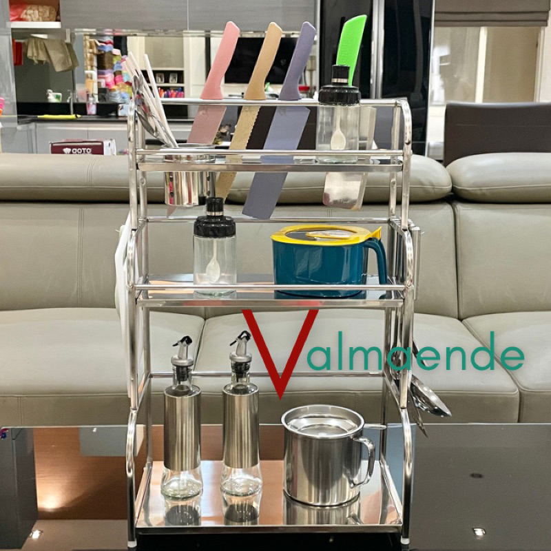 Fungsional : - 3 susun Rak - Berguna untuk tempat bumbu kecil dan besar - Terdapat wadah untuk menaruh pisau dapur - Terdapat kait untuk meletakkan wajan, spatula, serbet, dll