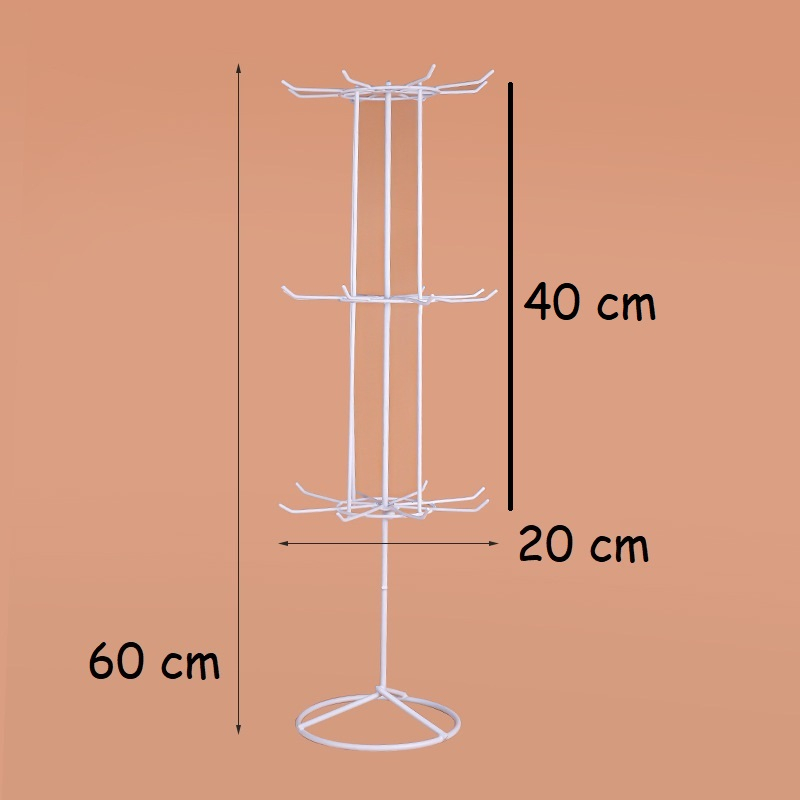 - Terdiri dari rak 3 susun sambung, bisa di putar - Mudah dirakit & bongkar pasang - 1 susun terdiri dari 8 jari - Panjang jari/gantungan 40 cm - Tinggi 60 cm - Diameter luas 20 cm - Penempatan di atas etalase atau meja