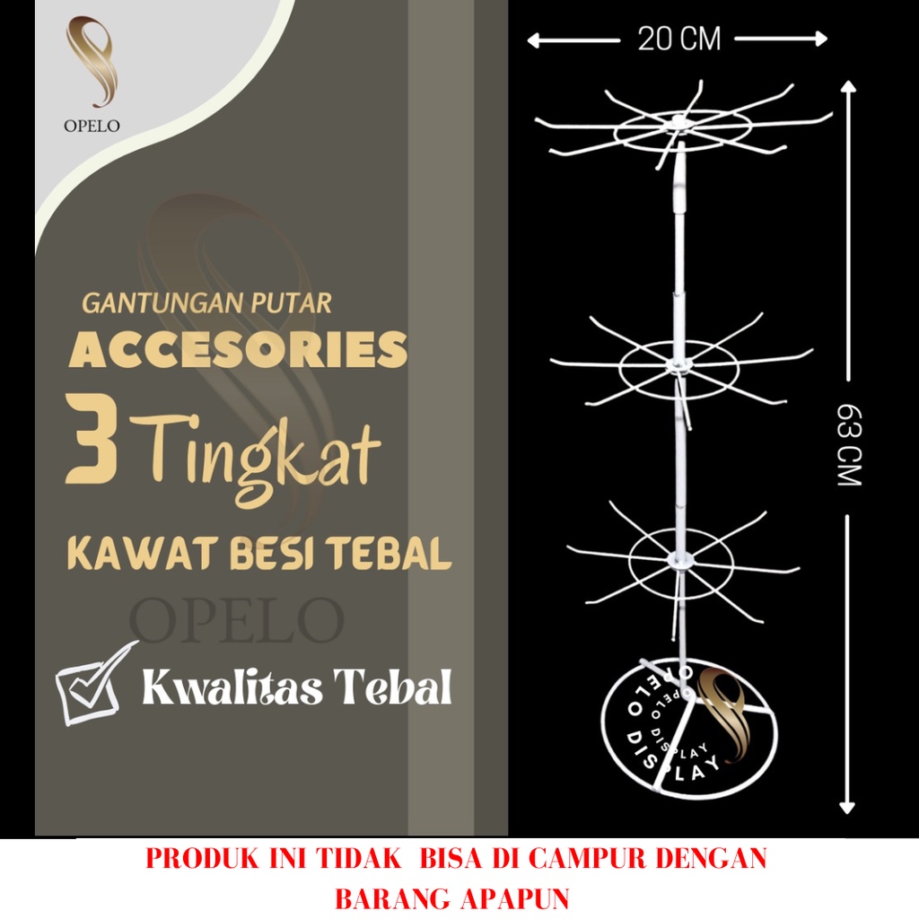 ~ Rak ini sering digunakan untuk menggantung aksesoris seperti gelang, kalung, lanyard, kunci, jam, anting, tali masker, masker, dsb. Terdiri dari 3 susun gantungan yang dapat diputar sehingga memudahkan dalam memilih barang. Bisa ditaruh diatas etalase ataupun meja. Terbuat dari bahan kawat besi yang tebal dan kuat. ~ Produk kami menggunakan kawat tebal sehingga kuat digunakan.