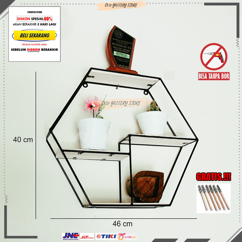Detail Rak Hexagon Hiasan Ambalan Besi Hexagonal Gantung Tempat penyimpanan Buku Bunga Kosmetik make up Makeup Bumbu Dapur Dekorasi Decorasi Perlengkapan Dinding Dingding Rumah Besi Segi lima 5 Tempel Ruang Tamu Kamar Tidur Cewek Kayu Jati Belanda Minimalis
